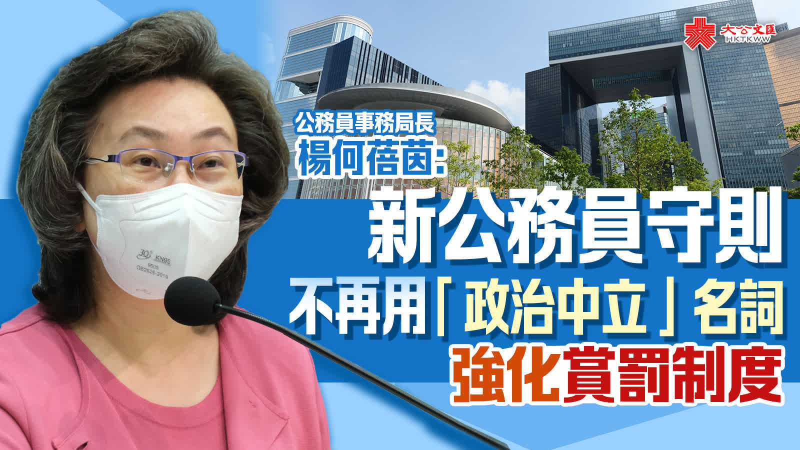 楊何蓓茵指出,新的《公務員守則》將不會再用「政治中立」這個名詞,會解釋公務員需要不偏不倚,不受政治取向的限制,除了少數公務員,其他公務員可以加入政黨,有其政治信念,但不能影響工作,要公平公正。楊何蓓茵強調,政治中立不能作為不執行政府決定的藉口,公務員必須對政府盡忠職守,提供意見時要客觀、基於事實。