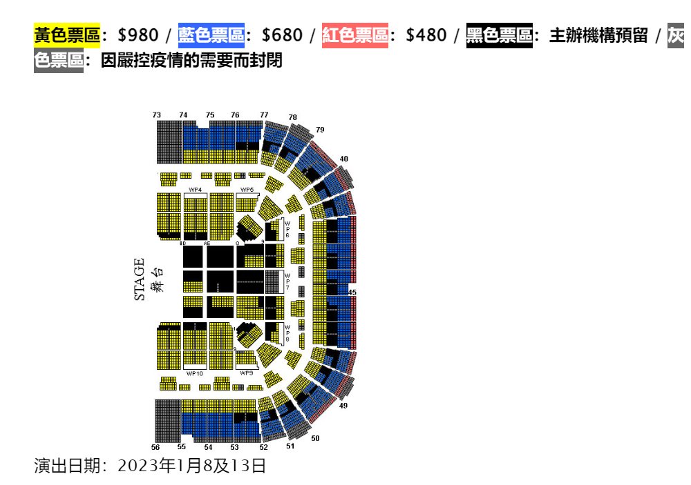 黃色票區:$980 / 藍色票區:$680 / 紅色票區:$480 / 黑色票區:主辦機構預留 / 灰色票區:因嚴控疫情的需要而封閉