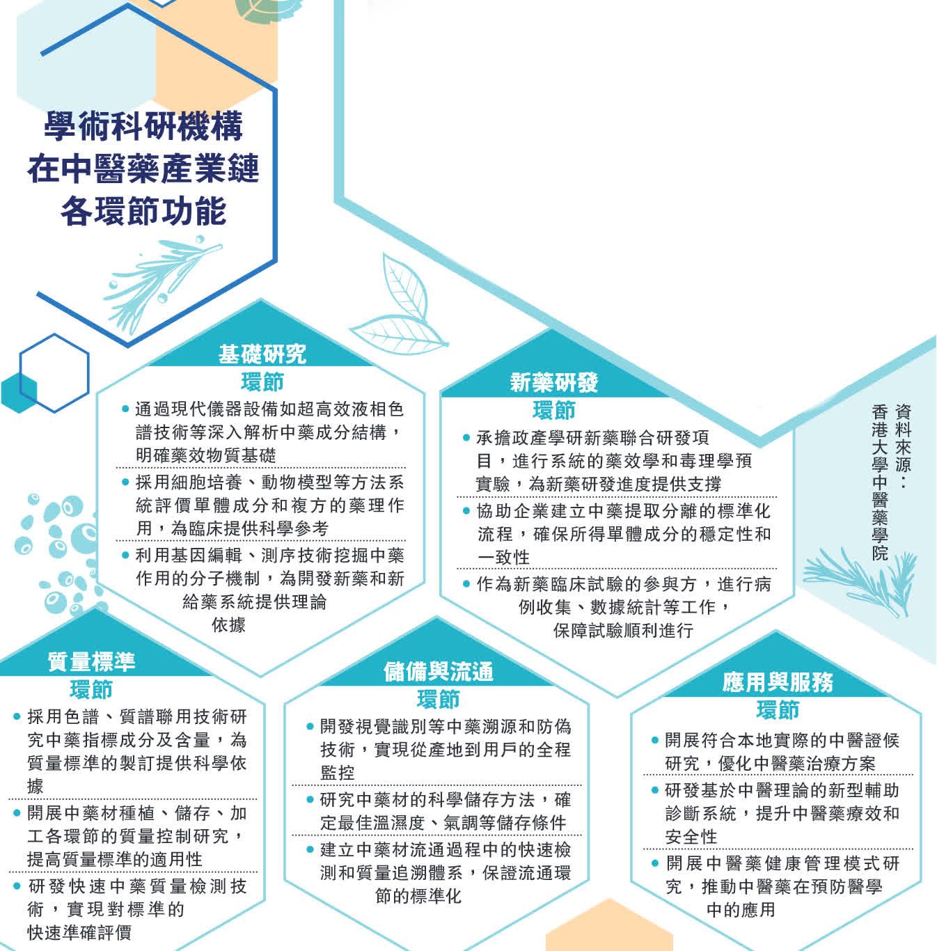 「中醫藥發展與整個中醫藥的產業鏈密切相關,只有全產業鏈得到全面平衡發展,才會對中醫藥發展發揮良性影響。」馮奕斌解釋,中醫藥的全產業鏈應包括中醫全產業鏈和中藥全產業鏈,中醫全產業鏈應涵蓋人才培訓、專業訓練、中醫服務、機構及專業人士管理等不同環節;中藥全產業鏈則指從原料、生產、產品到儲藏配送等全過程,「中醫中藥不分家,醫藥結合,以醫帶藥,在中醫中藥全產業鏈中,重要的是與時並進,品質監控,因此研究、標準的訂立和品質保證最為重要。」