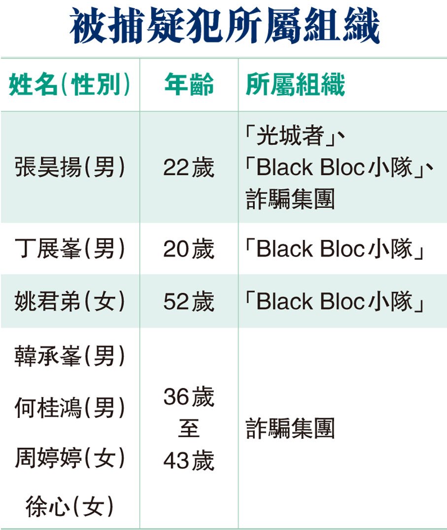 被捕4男3女年齡介乎20歲至52歲,分涉嫌干犯香港國安法第24條「參與實施恐怖活動」,還涉及「縱火」、「串謀縱火」、「串謀詐騙」及「洗黑錢」等罪名。其中,22歲被捕男子張昊揚,同時牽涉「光城者」、「BlackBloc小隊」及詐騙集團的罪案,屬主要核心人物。