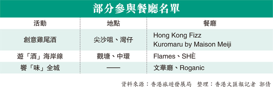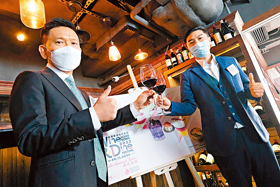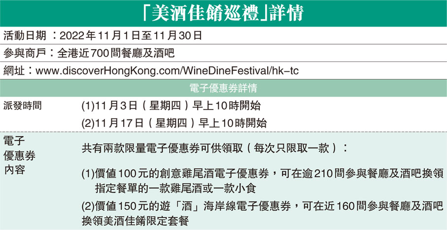 (香港文匯報記者 郭倩)香港逐步復常,盛事接踵而來。香港旅遊發展局昨日宣布,下月舉辦「美酒佳餚巡禮」,近700間餐廳及酒吧參與,今年以「品味全城」為主題,推出各式餐飲活動。旅發局首次送出5萬張分別價值100元及150元的美酒佳餚巡禮「電子優惠券」,將於下月3日和17日通過Discover Hong Kong電子平台派發,並預留另外一部分「電子優惠券」予「香港國際七人欖球賽」及「國際金融領袖投資峰會」的參與者,帶動全城氣氛。香港酒吧協會主席錢雋永預料,活動可為業界帶來二至三成生意增長。