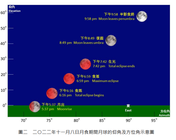 是次月食會在月出前開始,因此月亮會帶食而出。下午6時16分,月球會完全進入地球本影,即月全食開始,全食的階段歷時1小時26分鐘,至夜晚7時42分結束。月全食期間月亮不會完全消失,而會呈現暗紅色,這是因為太陽光中藍色的波段在地球大氣層中被散射,剩餘的紅光再被折射到月球上。整個月食過程會在晚上9時58分完成。