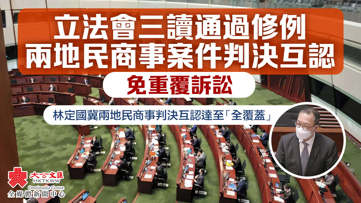 大公文匯全媒體報道,立法會今日(26日)三讀通過《內地民商事判決(相互強制執行)條例草案》,容許內地與香港兩地民商事案件判決互認,以實施香港特區政府與最高人民法院於2019年1月18日簽訂的《關於內地與香港特別行政區法院相互認可和執行民商事案件判決的安排》。