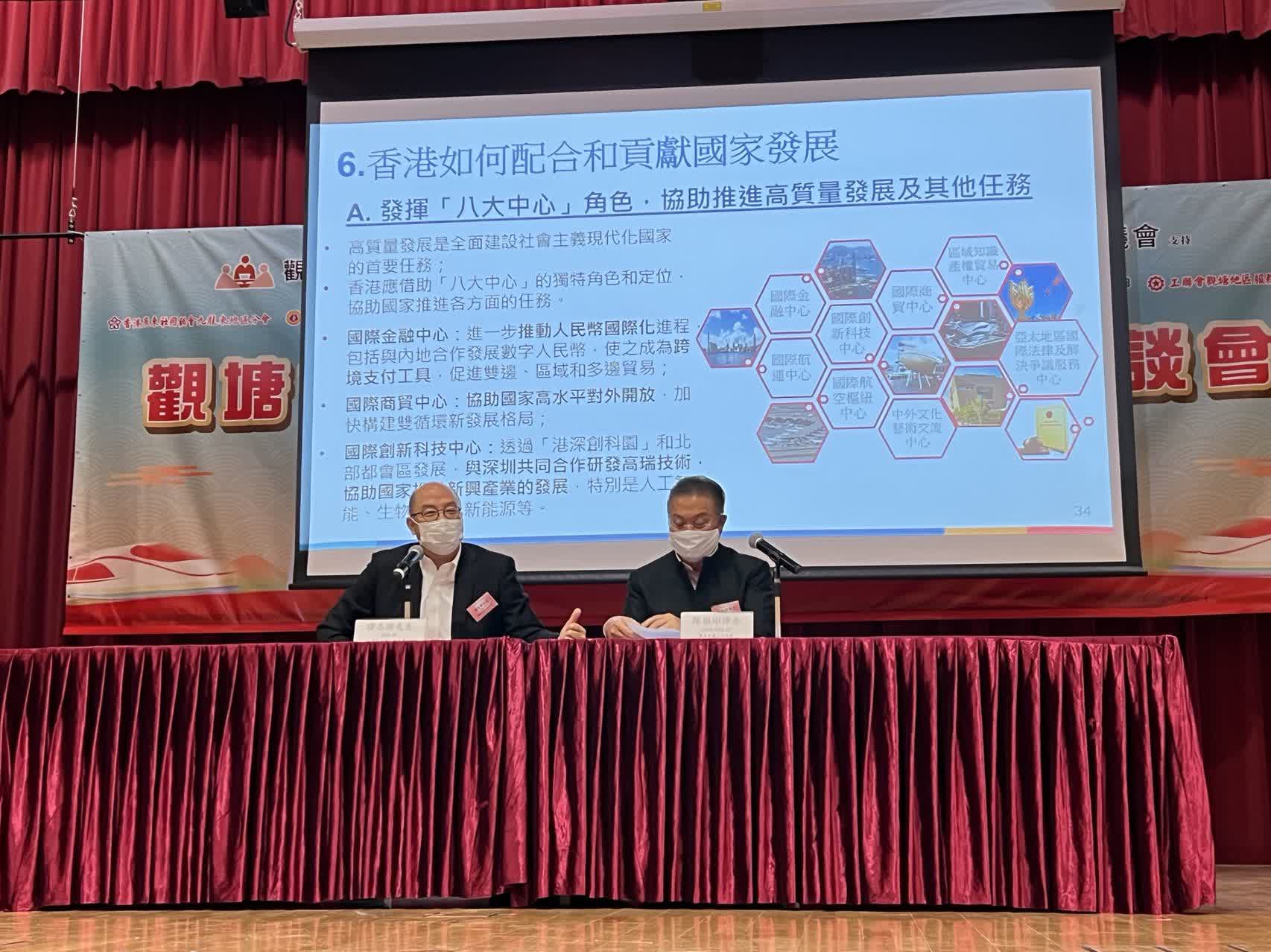 陳振彬和譚志源介紹黨代會的歷史沿革、二十大報告的主要內容,包括回顧過去十年成就、未來新征程的方向、目標及中心任務,亦講解報告提出的十二項行動綱領。他們表示,報告明確提出「一國兩制」是香港、澳門回歸後保持長期繁榮穩定的最佳制度安排,必須長期堅持,是習近平主席繼七一講話後,再次表明中央長期推行「一國兩制」的堅定立場。