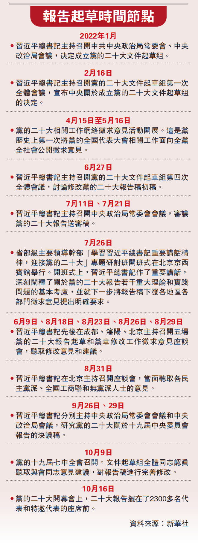 2022年2月16日,中南海懷仁堂。習近平總書記主持召開黨的二十大文件起草組第一次全體會議,宣布中央關於成立黨的二十大文件起草組的決定。文件起草工作正式啟動。會上,習近平總書記對起草工作進行動員和部署,要求充分認識黨的二十大報告起草工作的重大意義,深入研究報告起草涉及的重大理論和實踐課題,並指出起草報告有五個必須全面把握和深入思考的新的歷史特點──一是黨已經走過創造輝煌的一百年,正團結帶領人民承前啟後、繼往開來、在新的歷史條件下繼續奪取中國特色社會主義偉大勝利,中國發展面臨新的戰略機遇。二是黨團結帶領人民實現了第一個百年奮鬥目標,全面建成了小康社會,歷史性地解決了絕對貧困問題,踏上了實現第二個百年奮鬥目標、全面建設社會主義現代化國家新征程,中國發展面臨新的戰略任務。三是中華民族偉大復興取得歷史性成就,既進入了不可逆轉的歷史進程,也進入了乘勢而上、確保中華民族偉大復興不被遲滯甚至打斷的關鍵時期,中國發展面臨新的戰略階段。四是中國特色社會主義新時代已經走過第一個十年,必須繼續開創新時代中國特色社會主義事業新局面,中國發展面臨新的戰略要求。五是百年變局和世紀疫情相互交織,世界進入新的動盪變革期,世界和平與發展面臨嚴峻挑戰,外部環境更加不穩定、不確定,中國發展面臨新的戰略環境。