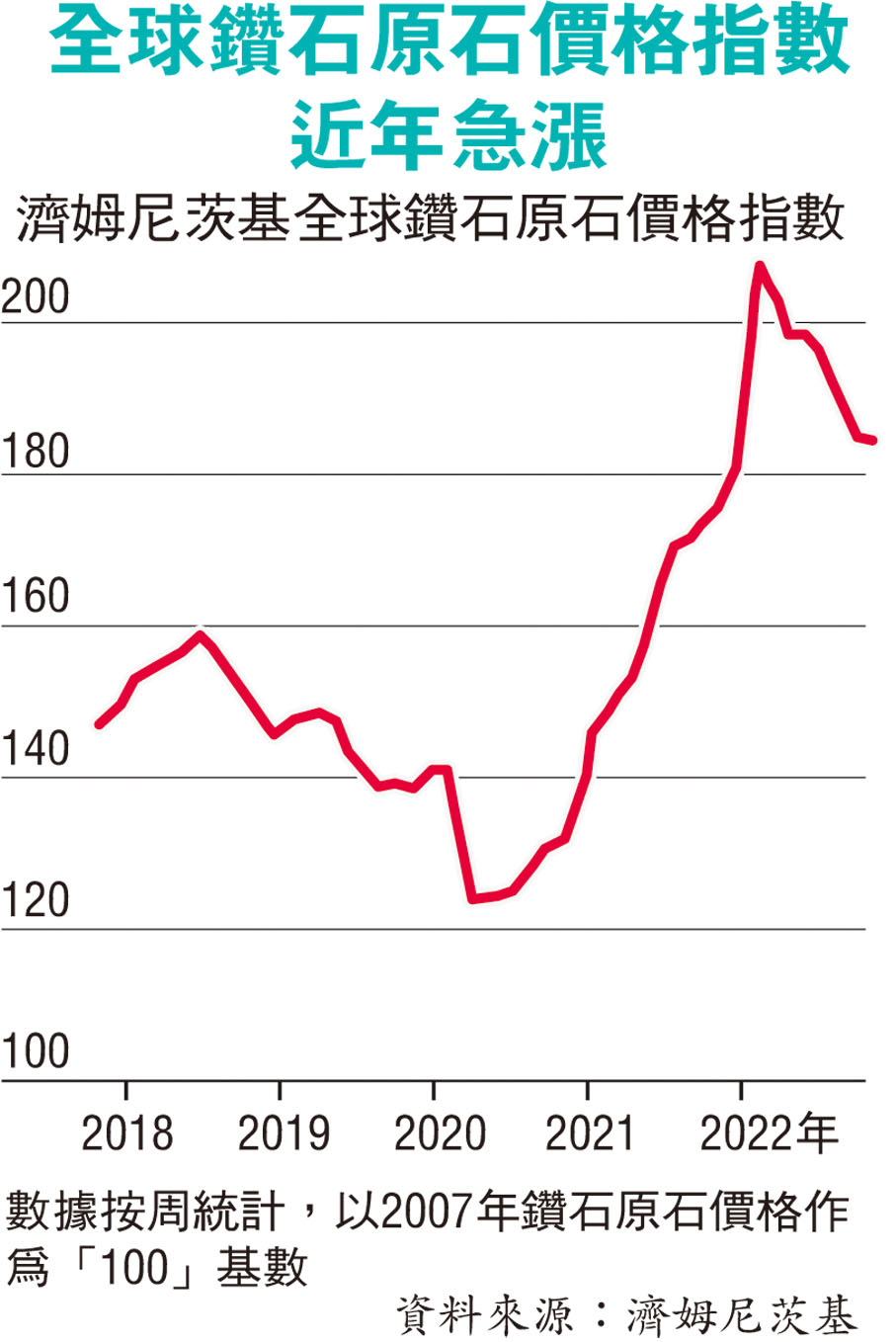 研究珠寶行業發展趨勢的美國諮詢公司Tenoris統計指出,截至本月,人造鑽石婚戒佔美國所有鑽石婚戒銷售額約10%。前者銷售額相較去年僅下跌約12%,遠低於後者的51%。Tenoris指出,疫情趨緩後的報復性消費,推動鑽石婚戒需求在去年激增,但今年有明顯回落,加上人造鑽石與天然鑽石婚戒均價差距接近500美元(約3,900港元),相信部分消費者會有意選擇人造鑽石節省開支。