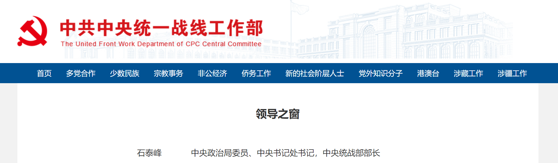 據中央統戰部官網「領導之窗」欄目10月27日晚間更新信息顯示,石泰峰已任中共中央政治局委員、中央書記處書記,中央統戰部部長。