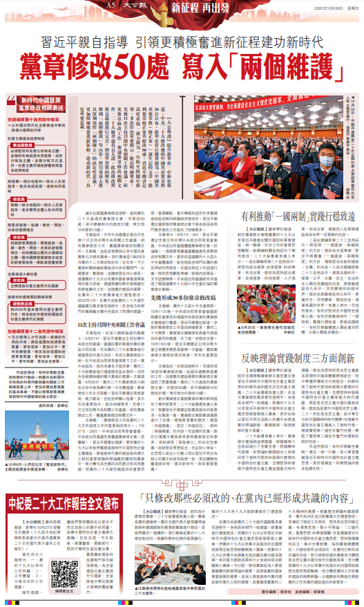 大公報綜合新華社、中新社報道:中共二十大修改後的中國共產黨章程26日公布,新華社當日播發題為《中國共產黨章程(修正案)》誕生記的文章,提到黨章修正案共修改50處,習近平總書記高度重視、親力親為,自始至終關心指導,多次作出重要指示、提出明確要求,先後11次主持召開中央相關工作會議,研究黨章修改工作、審議黨章修改相關文件。二十大秘書處負責人說,此次修改對黨員義務進行完善,增寫學習黨的歷史、做到「兩個維護」等內容,對引導廣大黨員深刻領悟「兩個確立」的決定性意義,更加積極地奮進新征程、建功新時代,具有重要意義。
