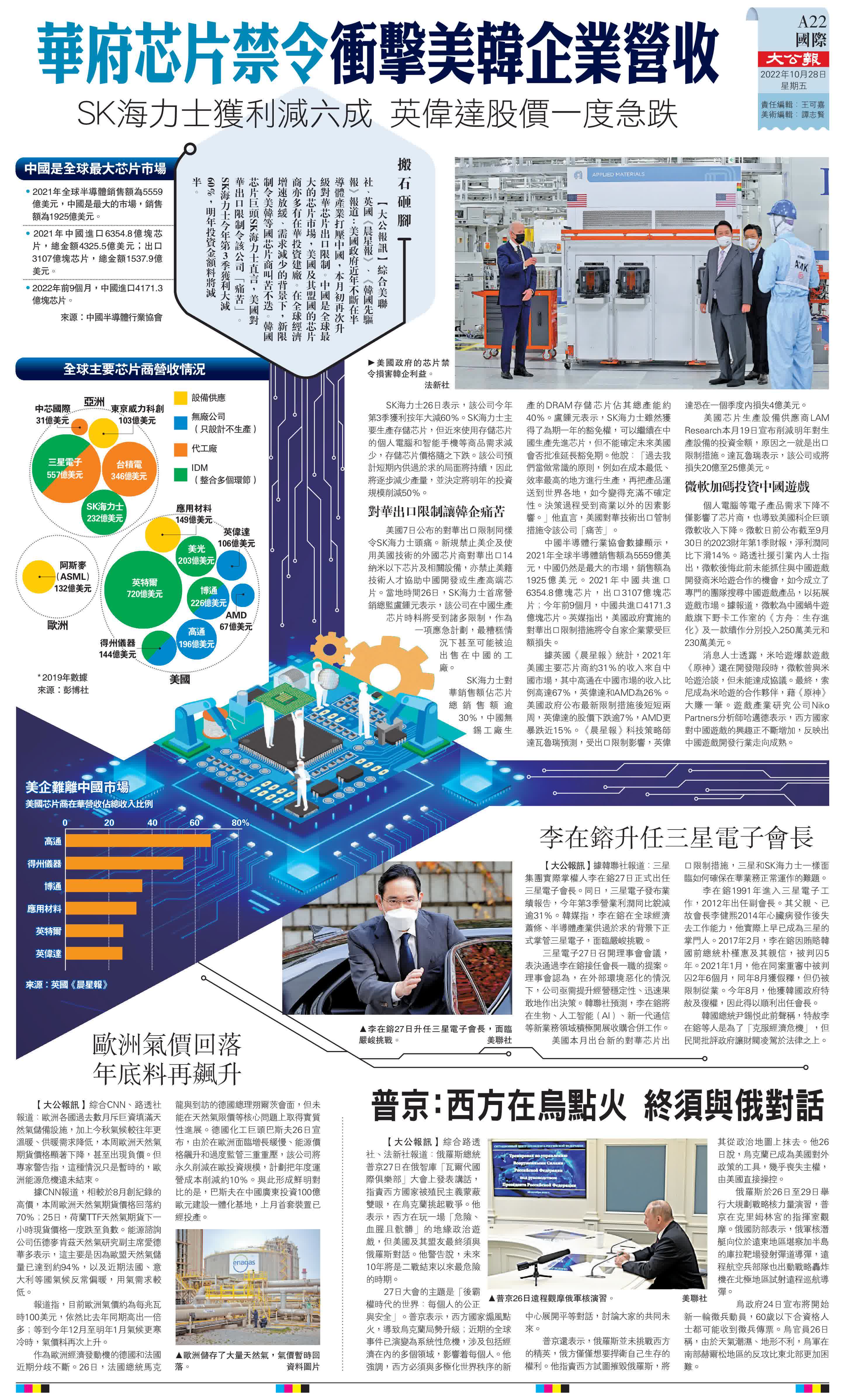大公報綜合美聯社、英國《晨星報》、《韓國先驅報》報道,美國政府近年不斷在半導體產業打壓中國,本月初再次升級對華芯片出口限制。中國是全球最大的芯片市場,美國及其盟國的芯片商亦多有在華投資建廠。在全球經濟增速放緩、需求減少的背景下,新限制令美韓等國芯片商叫苦不迭。韓國芯片巨頭SK海力士直言,美國對華出口限制令該公司「痛苦」。SK海力士今年第3季獲利大減60%,明年投資金額料將減半。