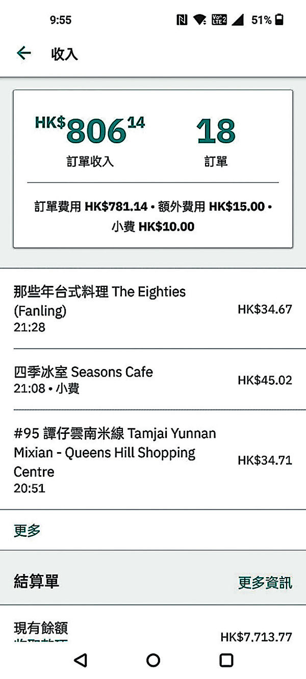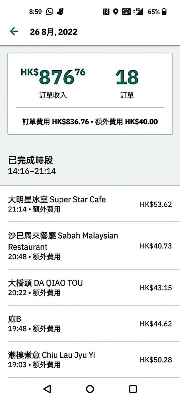 目前在其中一間外賣平台擔任車手的阿史,向記者出示8月某天的收入記錄約為876元。他當日共接18個訂單,平均每宗訂單賺約48.6元,但本月中的某天收入,他接了20張訂單,但在扣除10元的小費後約為806元,即平均每宗訂單僅賺取約39.8元。