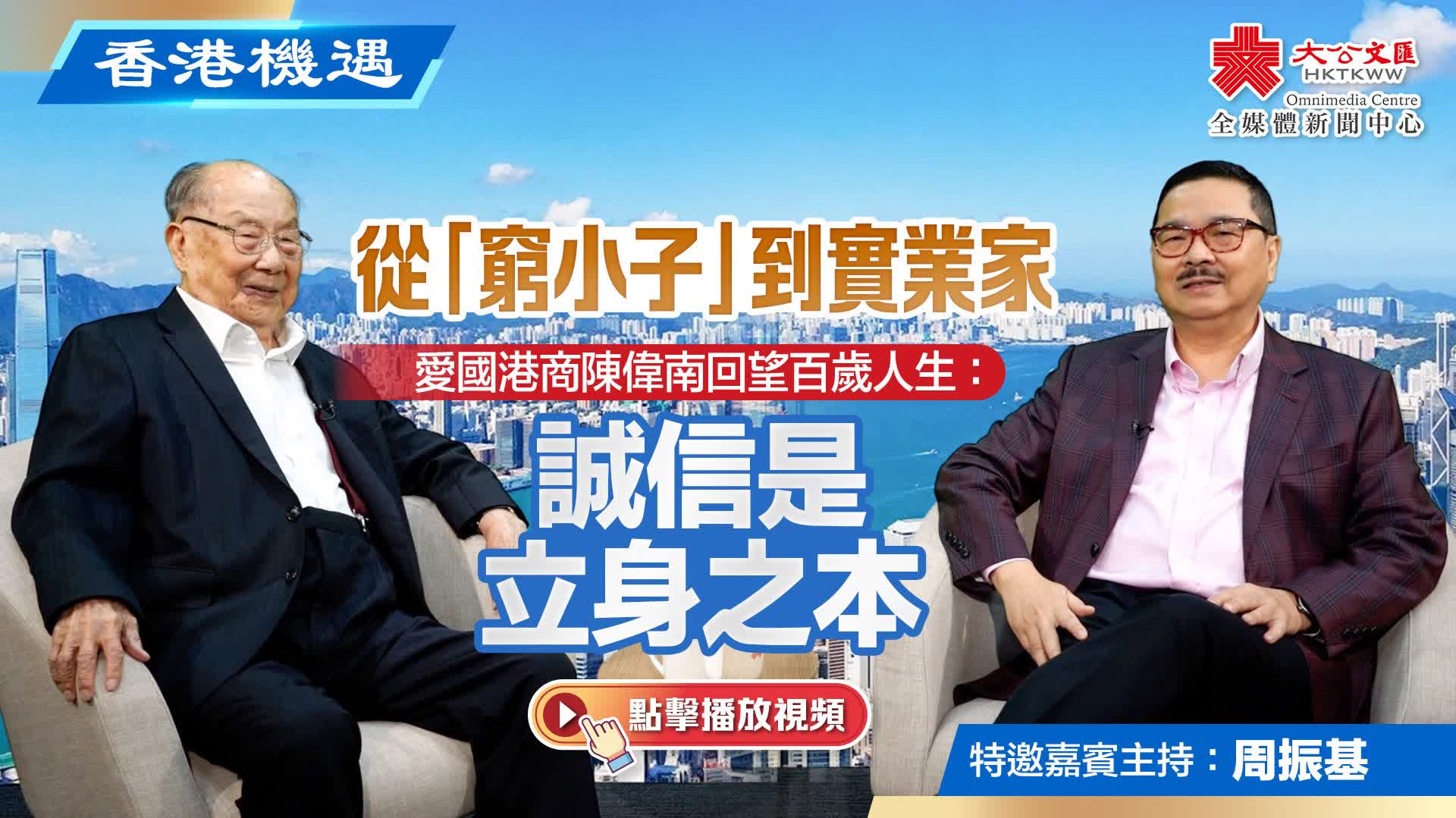 大公文匯全媒體報道:「事業成功在於努力,人生的價值在於奉獻。」愛國港商陳偉南將這句樸素不過的話視為他一生踐行的座右銘。這位出身潮州鄉村的「窮小子」,如何一步步打拼,成為叱咤香港商界的成功實業家?105歲高齡的他,又有怎樣的「長壽秘笈」?陳偉南做客新一期《香港機遇》欄目,與特邀嘉賓主持周振基一同傾談,講述他跨越世紀的風雨人生。