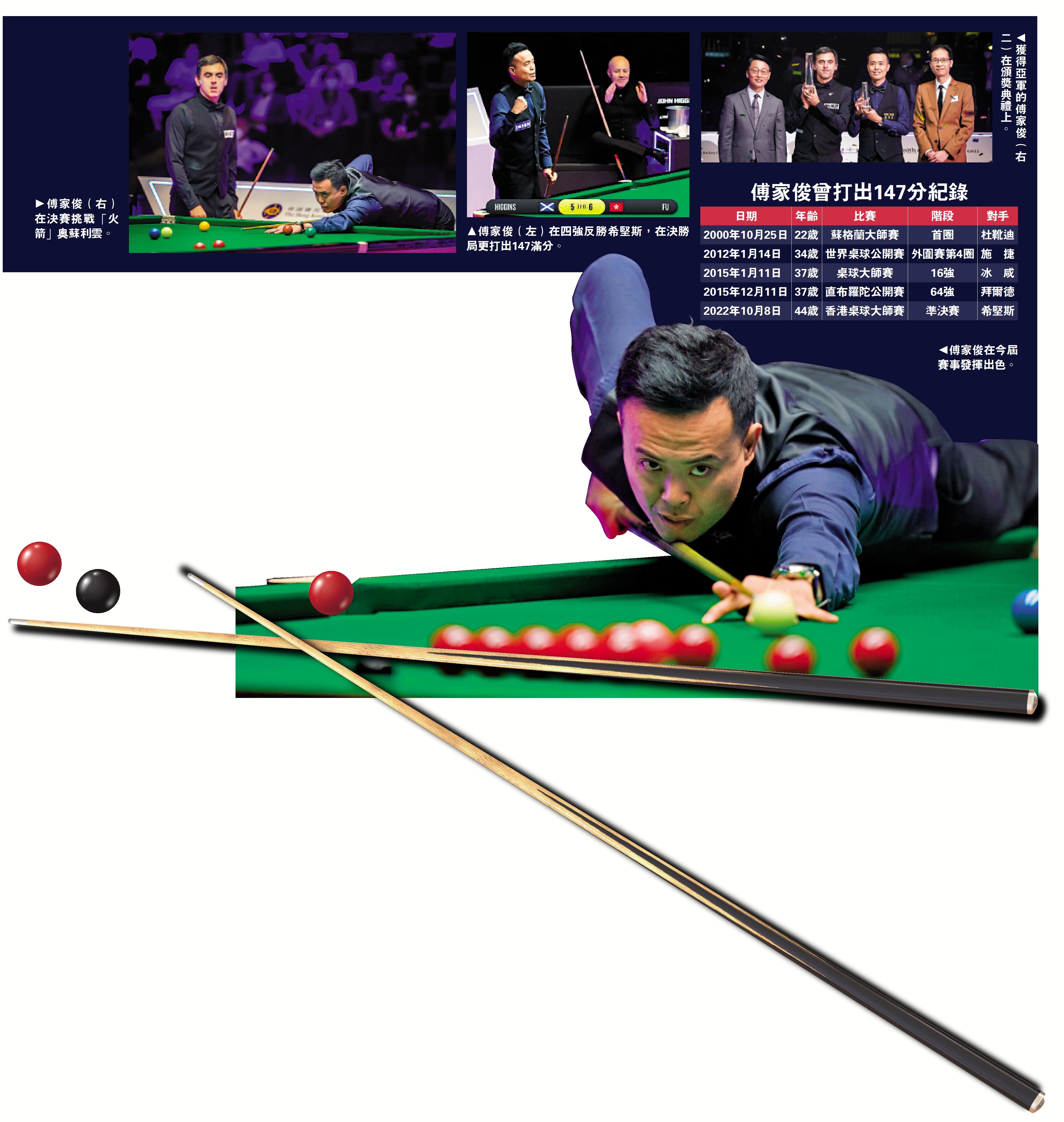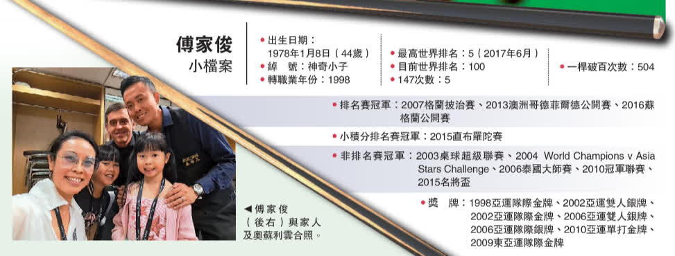 (大公報記者 梁潤森)自1998年展開職業桌球手生涯的傅家俊,一直為港爭光並推動桌球發展,曾5度打出單桿147,也曾數度揚威排名賽,2017年最高世界排名更去到第5名。當時處於高峰的他推出自傳「147人生」分享心路歷程。其後,傅家俊陷入數年低谷,突如其來的視網膜退化症、加上新冠疫情影響外出參賽,令世界排名急跌,但傅家俊未有認輸,他創辦大師桌球王國培育幼苗,從世界排名第100位出發,更成功在最近的香港桌球大師賽四強決勝局打出147奠勝。