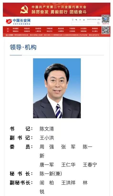據中國長安網「領導·機構」欄目顯示,陳文清已任中共中央政法委員會書記。