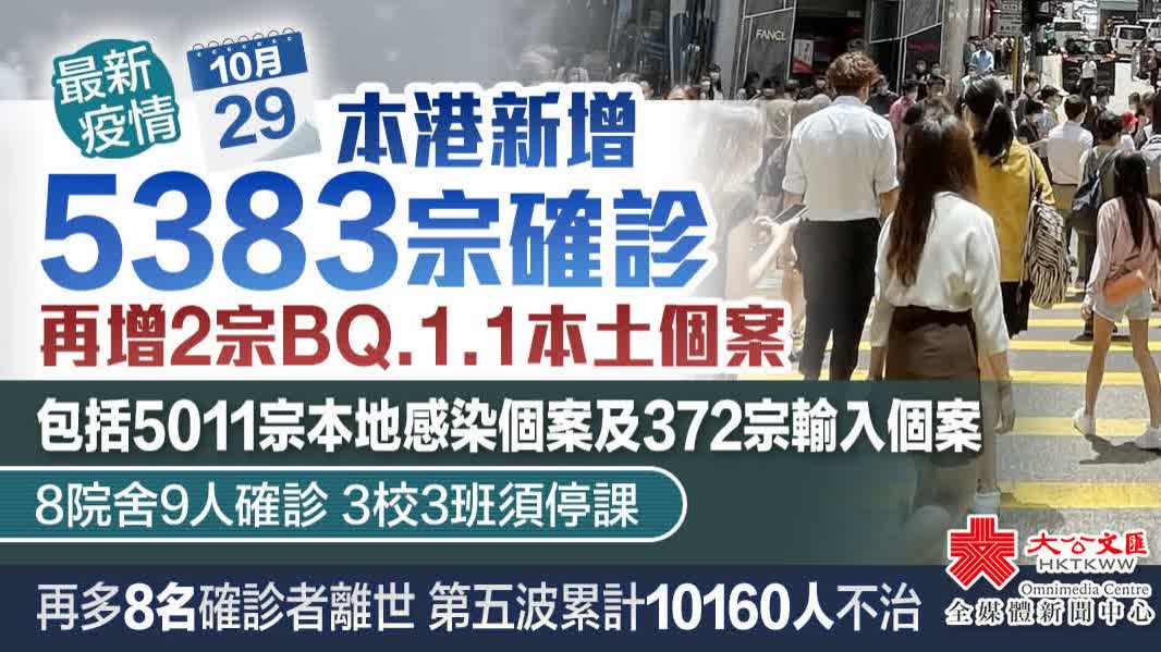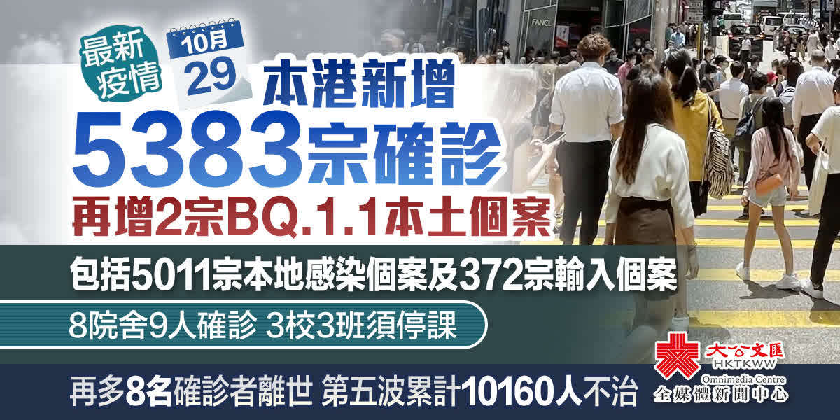 大公文匯全媒體報道,本港第五波疫情持續,衞生署衞生防護中心公布,截至今日(29日)零時,本港過去一日新增5383宗確診個案,當中包括5011宗本地確診個案及372宗輸入個案。本地確診個案中,核酸檢測陽性個案有1244宗,快測陽性個案3767宗。