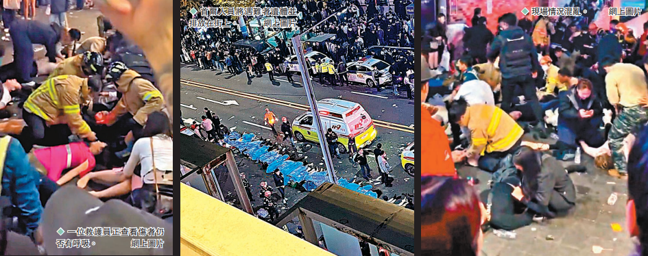 一名20歲女性哭道,她與同行在事發的梨泰院世界美食街走失後就失去聯絡,由於消防和警察也無法進入現場,所以根本不知道朋友死活。另一名目擊者表示,很多死傷者衣服都被撕爛,半裸地躺在地上,沒有受傷的人則為傷者進行急救,「這輩子第一次見到這種場面。」