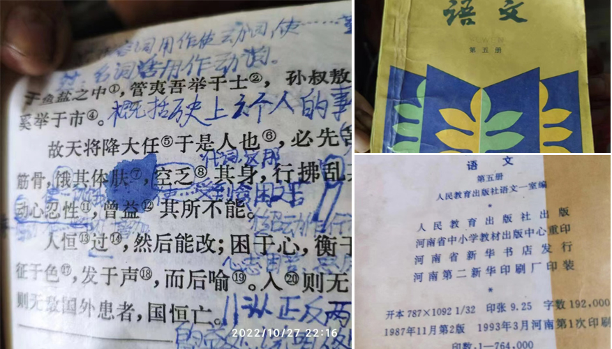 但隨後就有網友晒出更多照片「證據」,稱「寫着『斯人』的教材找到了!」這些照片顯示,由北京出版社2019年出版的義務教育教科書《語文》(九年級下冊)、冀教版小學語文(五年級下冊)和武漢大學出版社出版的《大學語文》等教科書中,都曾將孟子的原文寫為「天將降大任於斯人也」,證明教科書對於這一「金句」的表述其實並不統一。