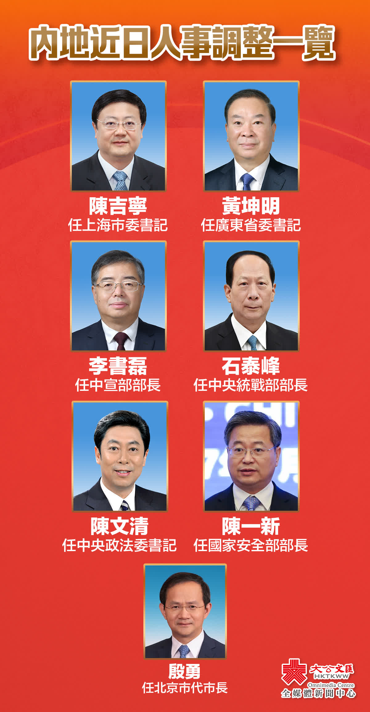 大公文匯全媒體報道,中共二十大勝利閉幕後,中共二十屆一中全會10月23日在北京舉行,選舉產生新一屆中央領導機構,選舉習近平、李強、趙樂際、王滬寧、蔡奇、丁薛祥、李希為中央政治局常委,習近平繼續擔任中央委員會總書記。近日,陸續宣布或公開報道部分省市、部分中央職能部門主要負責人職務調整,大公文匯全媒體整理了相關信息,助讀者一文睇清!