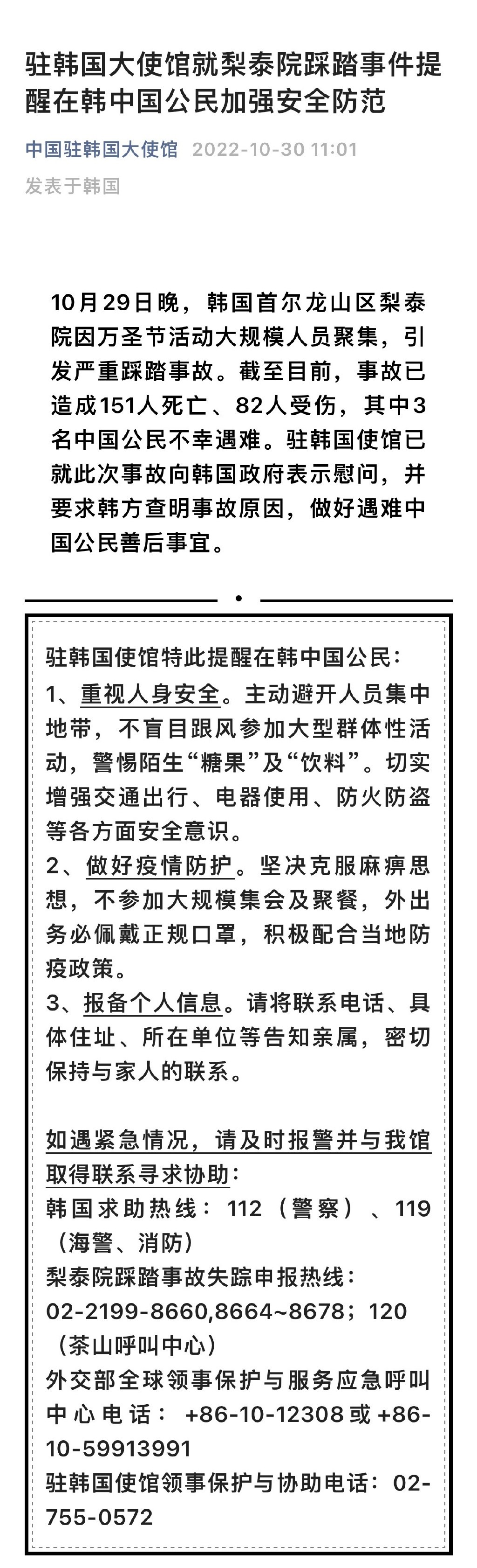 事故發生後,中國駐韓國大使館立即同韓警方等有關部門溝通並密切關注中國公民求助情況,得到一個不幸的消息:截至中午12時,已經有4名中國公民在此次事故中遇難,另有兩名中國公民在事故中受傷。