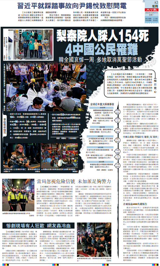 •截至10月30日,梨泰院踩踏事故死亡人數增至154人,另有133人受傷,其中37人傷勢嚴重。