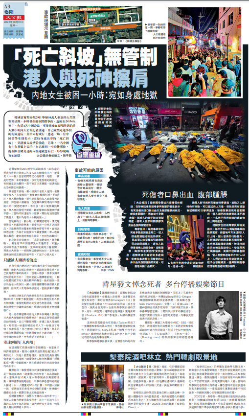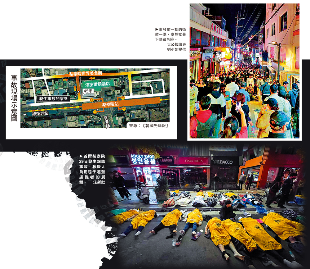 (大公報記者盛德文、陳子萌)韓國首爾梨泰院29日舉辦10萬人參加的大型萬聖節活動,不料發生嚴重踩踏事故,造成至少154人死亡,包括4名中國公民。事發當晚在現場附近的港人劉小姐向大公報記者講述,自己險些走進事發的街區遊玩,所幸未有成行,逃過一劫。有中國留學生則表示,當時身處出事的「死亡斜坡」,只能被人流擠着前進。另外,一名中國女生在社媒上表示,自己被困一小時後獲救,她親眼目睹旁邊的人接連窒息而亡,形容現場宛如地獄。