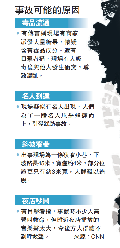 韓媒指出,事發現場位於漢密爾頓酒店後街,是一條路長45米,路寬僅4米的窄巷,且為陡峭斜坡。當晚共有10萬人進入梨泰院參加萬聖節活動,據韓國專家粗略估計,出事的窄巷當時約有百人擁堵,以一人體重約50公斤計算,100個人加在一起,受困者等於承受至少5噸的重量,身材嬌小纖瘦的女性,被壓住後尤其脆弱危險。
