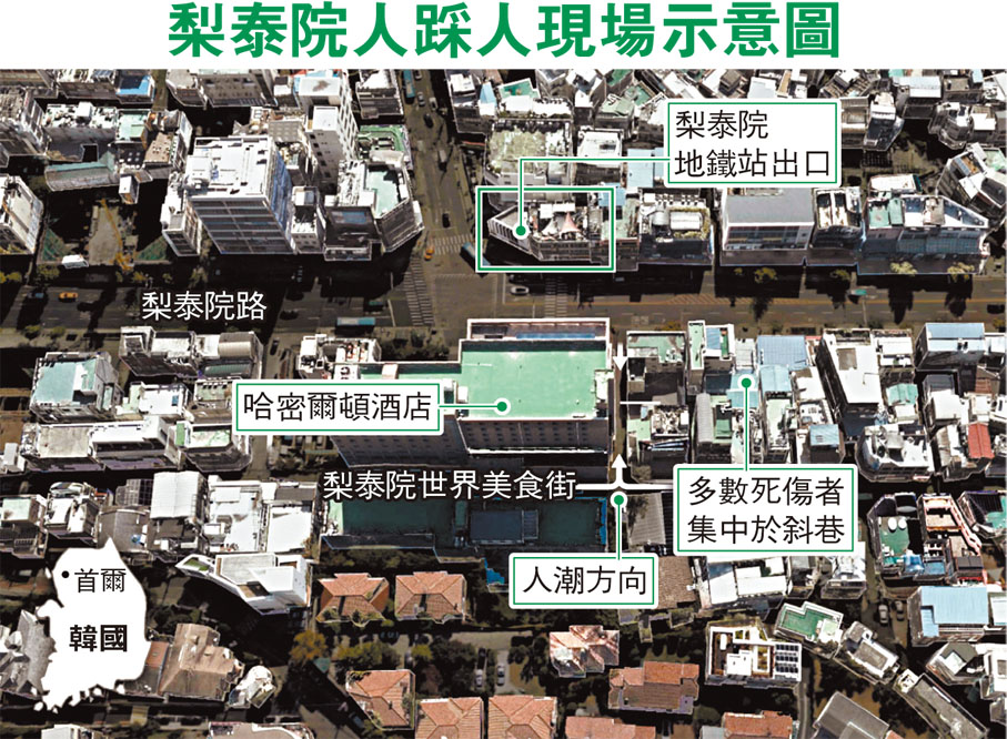韓聯社指出,斜巷全長約45米,寬度約為4米,只能容納5至6名成年人並行,過往已多次出現人群擠塞,今次事發地點更是只有3.2米寬的巷道最狹窄處。加上巷道一側就是哈密爾頓酒店的外牆,一旦發生危險,靠牆一側根本沒有逃生空間。網上流傳的片段顯示,事發前現場人群已經相當擠迫,而且人群之間經常不斷互相推擁,身處當中根本是身不由己。