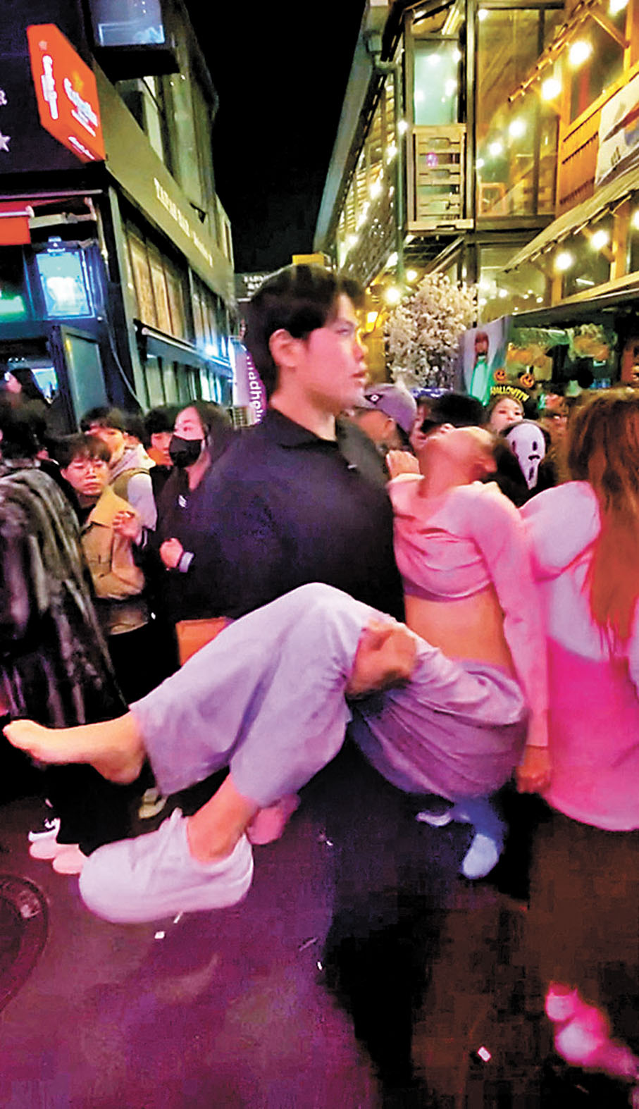 目擊者姜某同樣是在前晚8時左右進入梨泰院。她向記者回憶說,當天晚上9時多,大概有10萬人聚集在梨泰院。「本來很正常地走着,突然來了很多人。前面的人往後擠,後面的人往前擠,我們被夾在中間。我已經快無法呼吸,雙腳已經快離地了。我看見很多中間的人往旁邊的電箱上爬,我就踩着啤酒箱爬了上去,暫時遠離了人群。我覺得這是我離死亡最近的一次。」