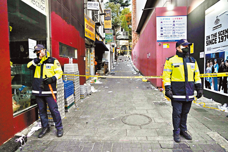 香港文匯報綜合報道,韓國首爾梨泰院前晚發生萬聖派對人踩人慘劇,造成至少154人死亡、133人受傷,逾4,000人失聯,是韓國歷來最嚴重的人踩人事故,也是當地自2014年「世越」號海難以來傷亡最慘重的公共事故。中國駐韓國大使館領僑處昨日證實,事故確認造成4名中國公民死亡、2名中國公民受傷。韓國當局亦確認受害人包括來自14個國家的26名外籍人士,分別是中國、美國、伊朗、烏茲別克斯坦及挪威等。韓媒報道指出,事發斜巷最狹窄處僅寬3.2米,卻有來自兩個方向的大批人流會合,極易發生事故,加上梨泰院交通擠塞,嚴重影響救援進度,最終釀成悲劇。