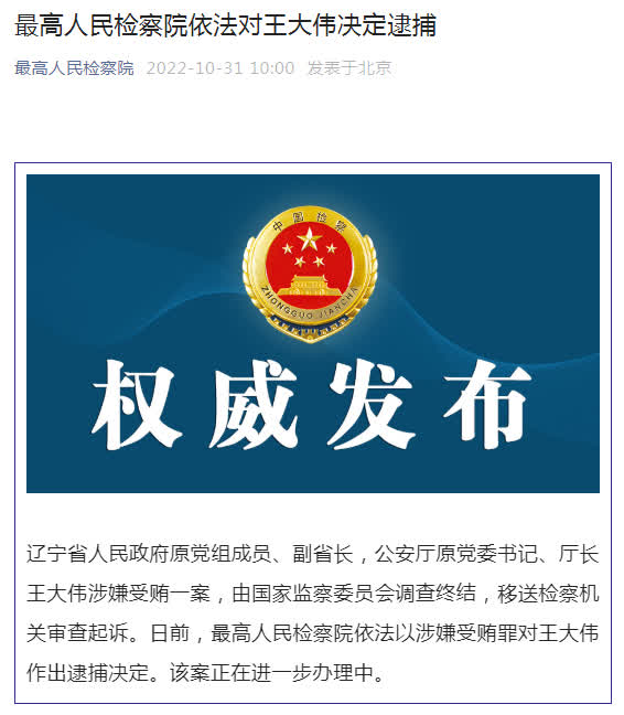 據最高人民檢察院微信公眾號消息,遼寧省人民政府原黨組成員、副省長,公安廳原黨委書記、廳長王大偉涉嫌受賄一案,由國家監察委員會調查終結,移送檢察機關審查起訴。日前,最高人民檢察院依法以涉嫌受賄罪對王大偉作出逮捕決定。該案正在進一步辦理中。