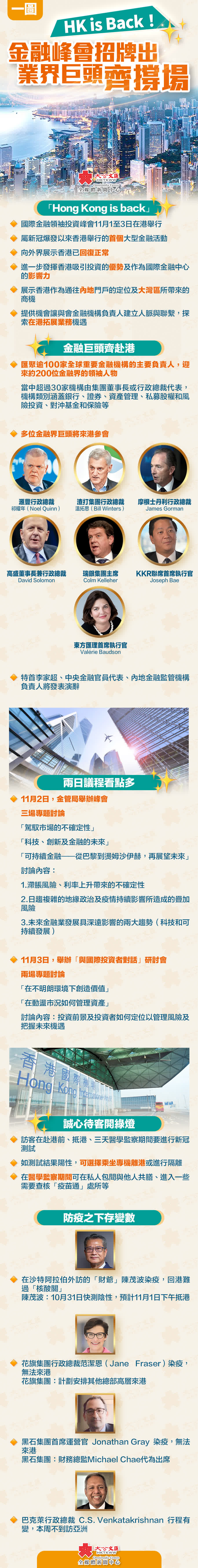 大公文匯全媒體報道,國際金融領袖投資峰會今起一連兩日在港舉行,這是新冠疫情爆發以來香港舉行的首個大型金融盛事,約200名金融界領袖出席,多名重量級金融機構高層均赴港「撐場」,出席嘉賓名單星光熠熠。金管局以「Hong Kong is Back」口號,希望帶出復常訊息。