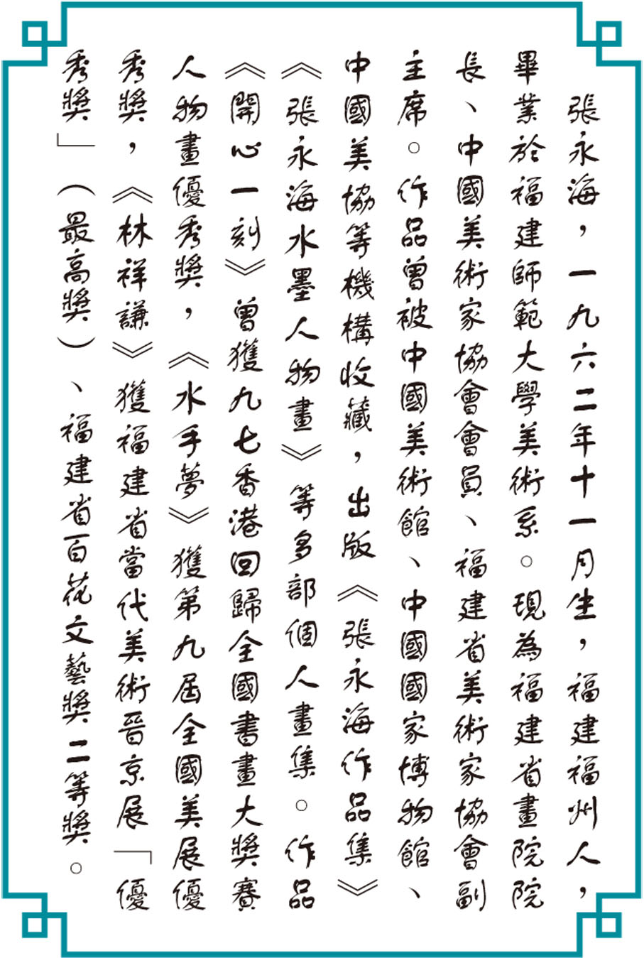 張永海,一九六二年十一月生,福建福州人,畢業於福建師範大學美術系。現為福建省畫院院長、中國美術家協會會員、福建省美術家協會副主席。作品曾被中國美術館、中國國家博物館、中國美協等機構收藏,出版《張永海作品集》《張永海水墨人物畫》等多部個人畫集。作品《開心一刻》曾獲九七香港回歸全國書畫大獎賽人物畫優秀獎,《水手夢》獲第九屆全國美展優秀獎,《林祥謙》獲福建省當代美術晉京展「優秀獎」(最高獎)、福建省百花文藝獎二等獎。