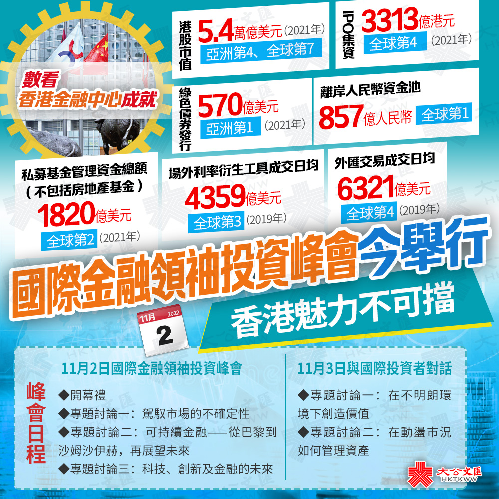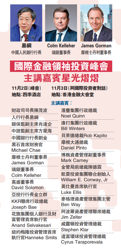 國際金融領袖投資峰會匯聚超過200位來自全球約120家金融機構的國際和地區負責人,當中超過40家機構由集團董事長或行政總裁代表,機構類別涵蓋銀行、證券、資產管理、私募股權和風險投資、對沖基金和保險公司等各個金融界別。峰會以「駕馭市場的不確定性」為主題,將有包括主題演講、專題討論和對話環節。內地金融監管機構負責人將分享政策觀點,而與會者會就圍繞全球金融界面臨的三大挑戰和機遇,包括利率上升和滯脹風險帶來的不確定性,以及科技和可持續發展等大趨勢對金融發展的影響等議題交流意見及分享經驗。