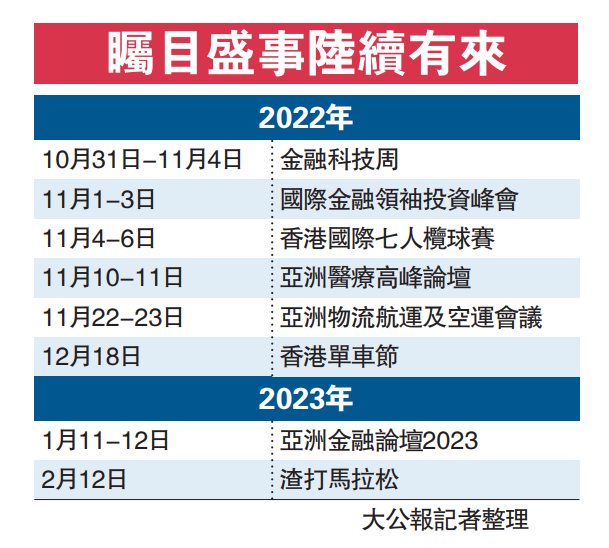 「這兩個星期香港充滿了動力和活力!」行政長官李家超昨日表示,香港金融科技周正在會議展覽中心舉行,而七人欖球賽、亞洲醫療健康高峰論壇亦將在本月陸續舉辦。這些異彩紛呈的活動,令東方之珠充滿了勃勃生機,魅力沒法擋。他說,特區政府將在疫情可控情況下容許舉辦更多活動,令整體社會與外國接軌方面更加推進,讓大家有更多機會參與不同的活動和推展整個香港。