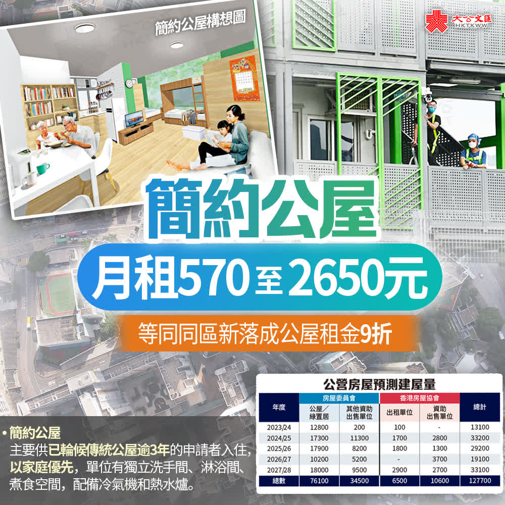 新一份施政報告提出利用短期內未有發展計劃的官地和私地,以標準簡約設計及組裝合成法,快速建成簡約公屋。據悉,簡約公屋面積約為10至31平方米;而房屋局局長何永賢早前在社交平台貼出的簡約公屋初步設計圖顯示,簡約公屋是開放式設計,沒有梗房,但空間頗寬敞,除廁所外,可規劃為睡房區、生活區、用餐區及煮食區。