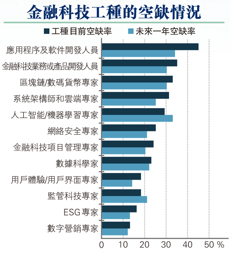 報告指出,65%受訪企業表示不強求金融科技技術性崗位擁有金融服務相關知識,而64%受訪企業認為擁有一些技術知識的金融科技非技術性崗位,例如項目管理經理及數碼營銷專家,會更具競爭力。