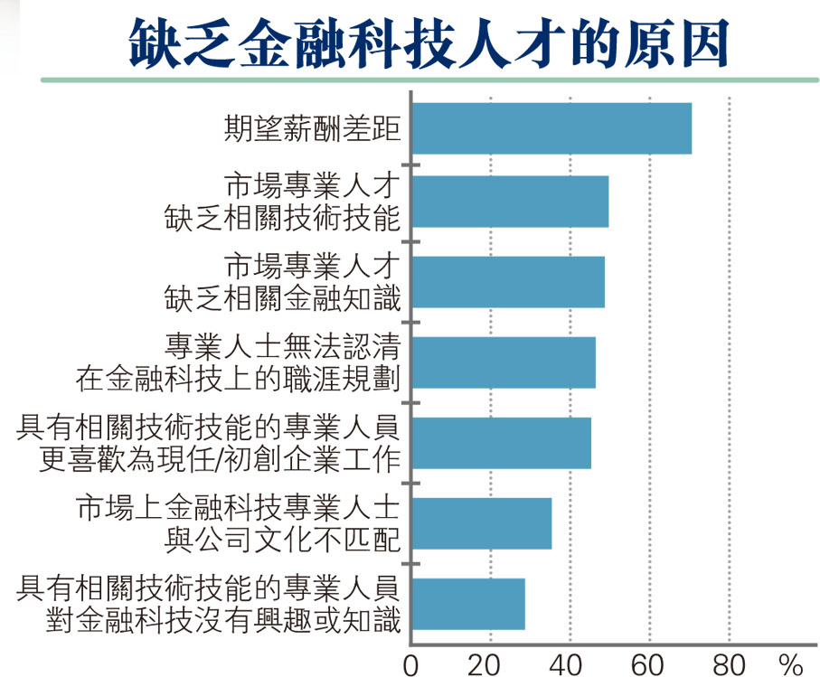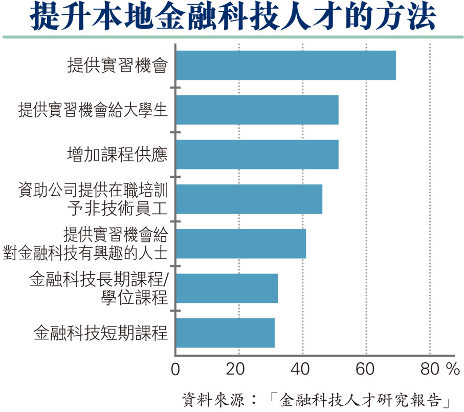 香港大學—渣打慈善基金金融科技學院、數碼港及生產力促進局昨在香港金融科技周發布「金融科技人才研究報告」,發現超過一半(57%)受訪企業表示正在積極招攬金融科技專才,尤其是技術性崗位,造成金融科技人才缺口的最大成因是期望薪酬差距,其次是缺乏相關技能。69%受訪企業認為實戰經驗如實習工作更為重要,而提供更多金融科技相關課程能幫助有潛力的人才建立相關基礎。