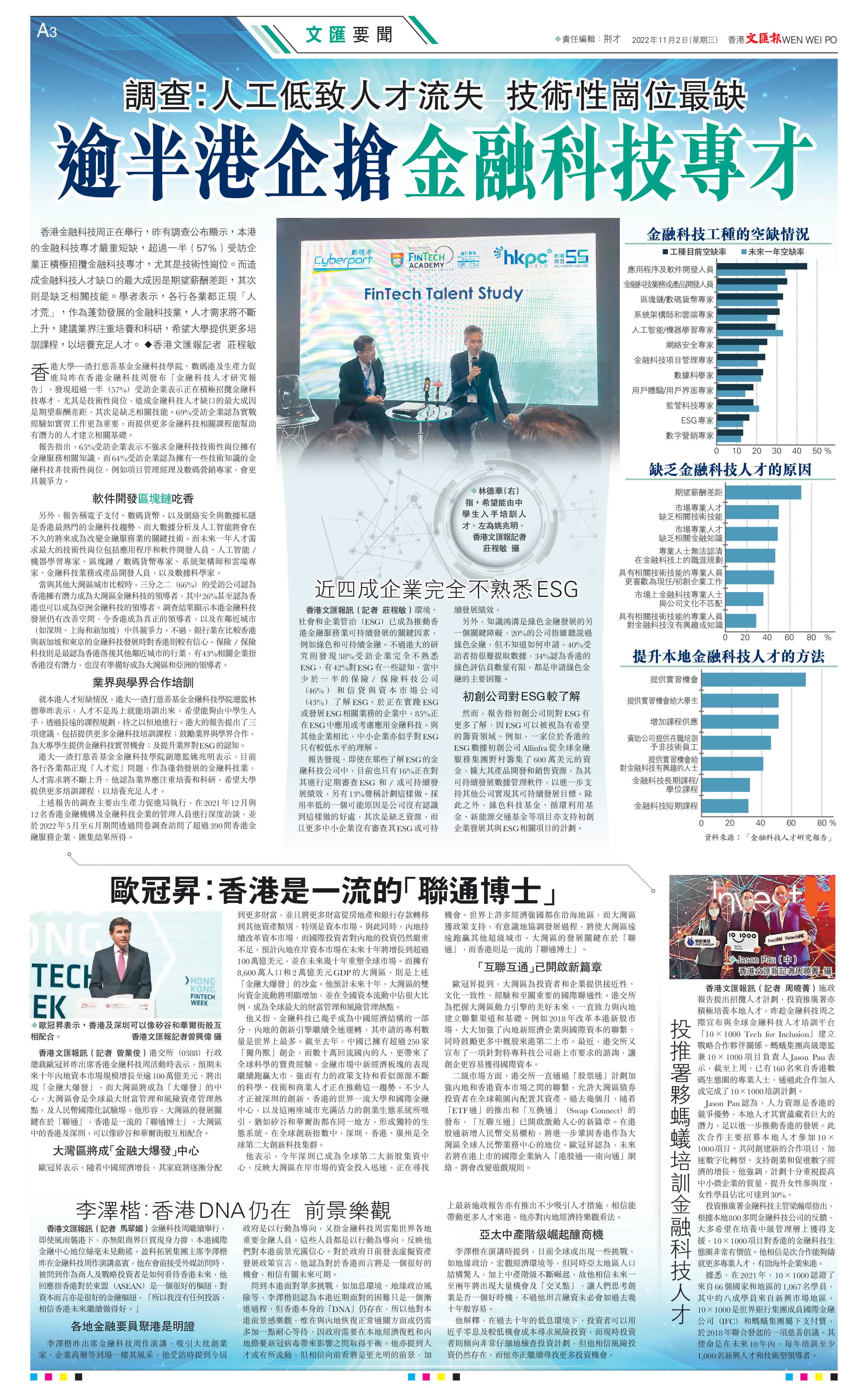就本港人才短缺情況,港大—渣打慈善基金金融科技學院總監林德華昨表示,人才不是馬上就能培訓出來,希望能夠由中學生入手,透過長遠的課程規劃,持之以恒地進行。港大的報告提出了三項建議,包括提供更多金融科技培訓課程;鼓勵業界與學界合作,為大專學生提供金融科技實習機會;及提升業界對ESG的認知。