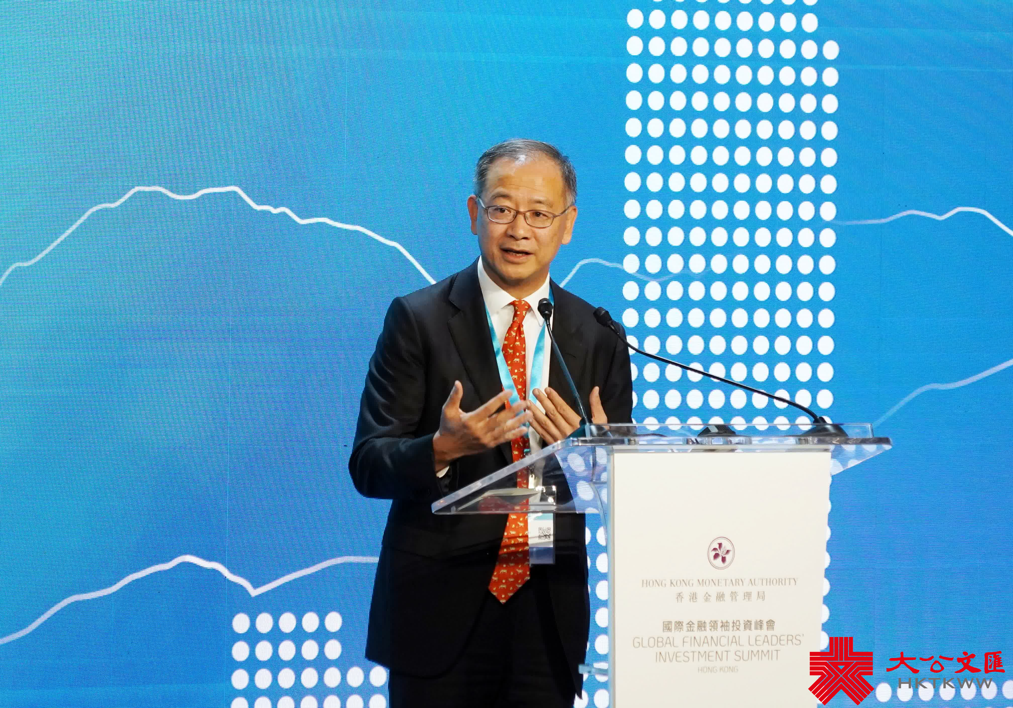 香港金融管理局總裁余偉文致辭時表示,歡迎來自世界各地的朋友出席國際金融領袖投資峰會,希望與各位朋友重新建立聯繫,讓大家看到香港「回來了」。他表示,中國有句話叫「貴人出門招風雨」,外面現在大風大雨,證明在座各位在環球金融界都扮演很重要的角色。