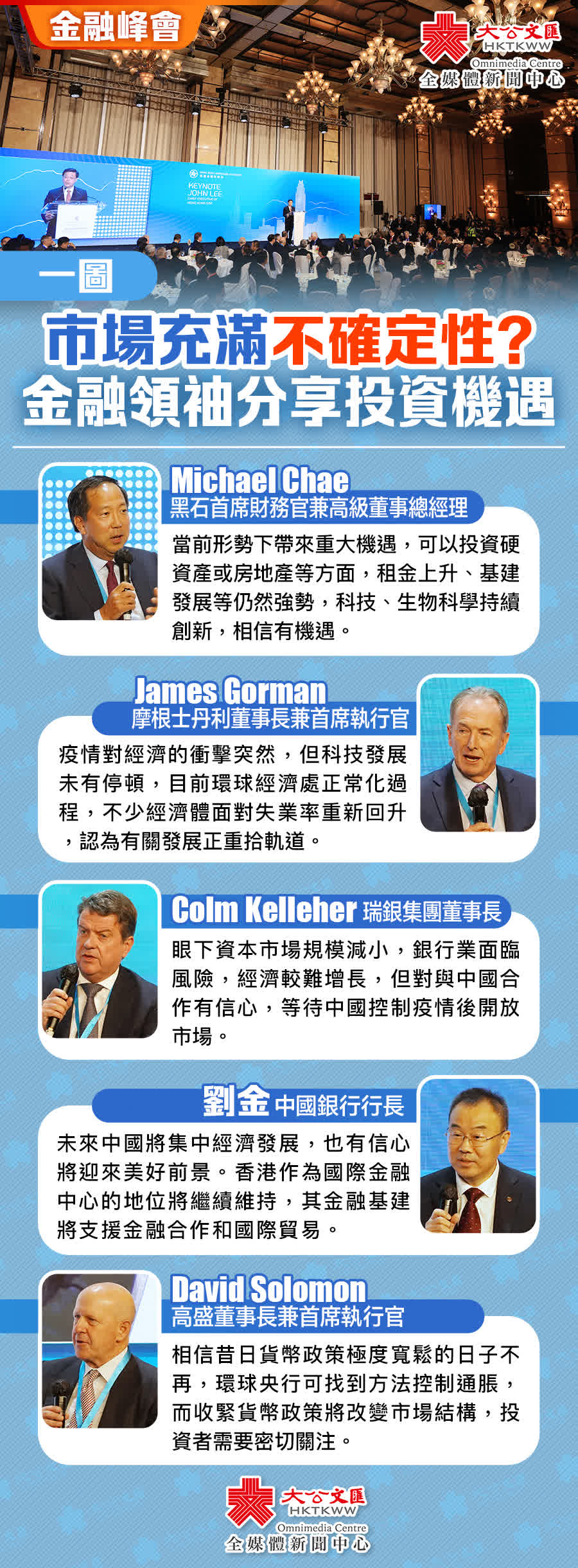 第一個專題討論以「駕馭市場的不確定性」為主題,由香港金融管理局總裁余偉文主持,邀請摩根士丹利董事長兼首席執行官James Gorman、黑石首席財務官兼高級董事總經理Michael Chae、瑞銀集團董事長Colm Kelleher、中國銀行行長劉金、高盛董事長兼首席執行官David Solomon,圍繞當前錯綜複雜的國際形勢下不確定性陡增,企業重新思考運營、投資和管理風險的策略,共同探討將如何調整戰略、運營、投資方向,以應對挑戰並在市場波動中把握機遇。一圖看下各位金融領袖的真知灼見!
