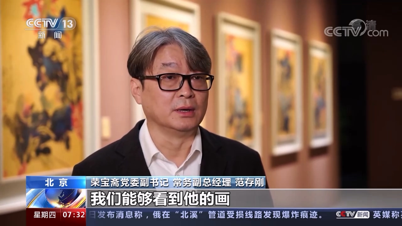 榮寶齋黨委副書記常務副總經理范存剛:他的繪畫當中,我們能夠看到他的畫是有中國的根和魂的,儘管他有些潑墨、潑彩,但是一些細節,一些能夠表現技巧的地方,恰恰是中國傳統的筆墨來展現。