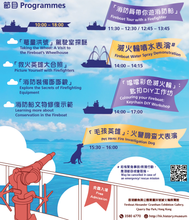 同樂日將於當日上午10時至下午6時舉行,焦點活動為下午2時的滅火輪噴水表演。市民亦可以走進葛量洪號滅火輪的駕駛室探秘,與消防員在船上合照留念和即場參加「消防員帶你遊消防船」活動,由駐船退休消防員當導賞員,分享昔日船上的點滴。其他精彩活動還有火警調查犬表演及特色滅火輪匙扣工作坊。