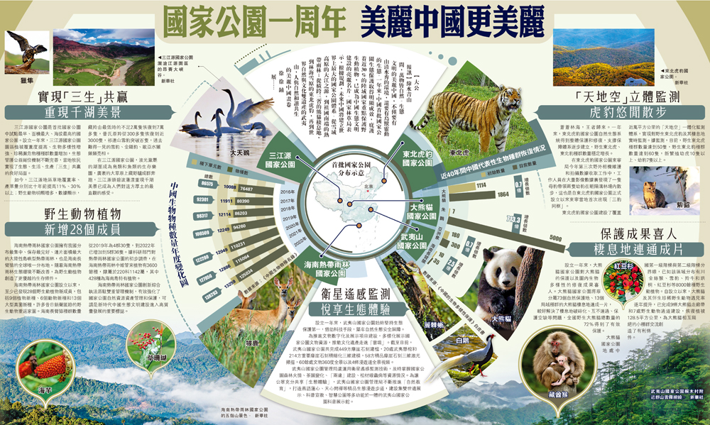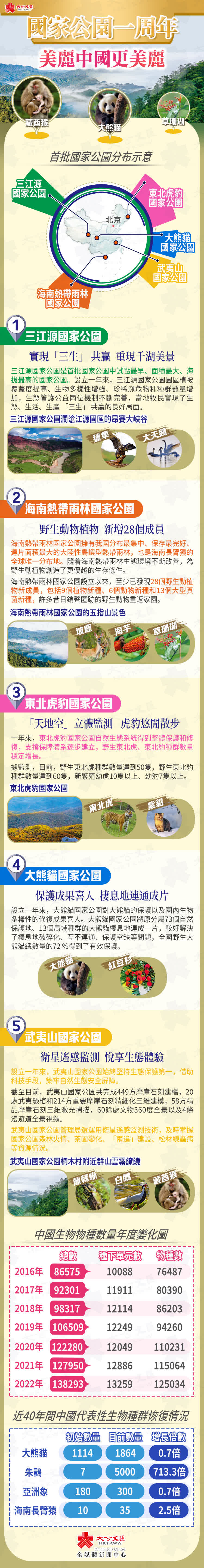 大公報訊:綠水青山間,萬物皆自然。生態文明的美麗中國,不僅要有山清水秀的環境,還要有鳥獸靈動的生態。一年來,中國首批國家公園生態保護取得明顯成效,庇護着近30%的陸域國家重點保護野生動植物,已成為中國生態文明建設的亮麗名片。國家林草局表示,根據規劃,未來中國將建立世界上最大的國家公園體系。從雪域高原的大江之源,到祖國南端的熱帶雨林;從橫跨三省的熊貓棲息地,到林海雪原的東北虎豹,再到世界自然與文化雙遺產的武夷山,人與自然和諧共生的美麗中國畫卷徐徐鋪展……