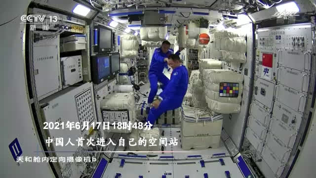 2021年6月17日18時48分,航天員聶海勝、劉伯明、湯洪波先後進入天和核心艙,中國人首次進入自己的空間站。