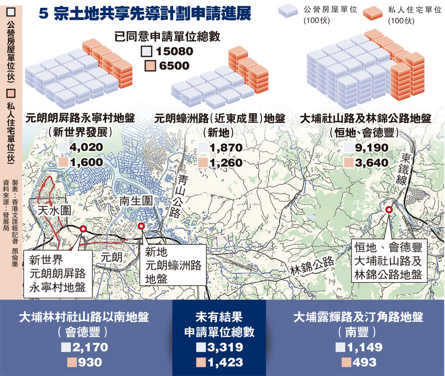 「土地共享先導計劃」至今共接獲5宗申請,首宗為南豐旗下的大埔露輝路及汀角路綠化地帶用地,於去年7月底申請發展1,642伙公私營單位。其餘為新地旗下元朗蠔洲路(近東成里)地皮、恒地及會德豐地產聯合發展的大埔社山路及林錦公路(近林村)地皮、會德豐地產的大埔林村社山路以南用地,以及新世界發展持有的元朗朗屏路永寧村用地。5宗申請共涉及約39公頃土地,擬建合共約1.84萬個資助房屋及約7,923伙私樓。