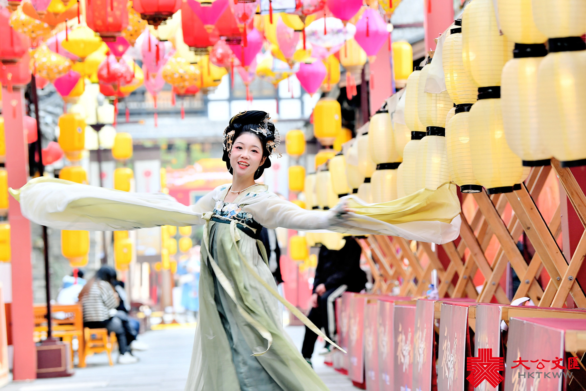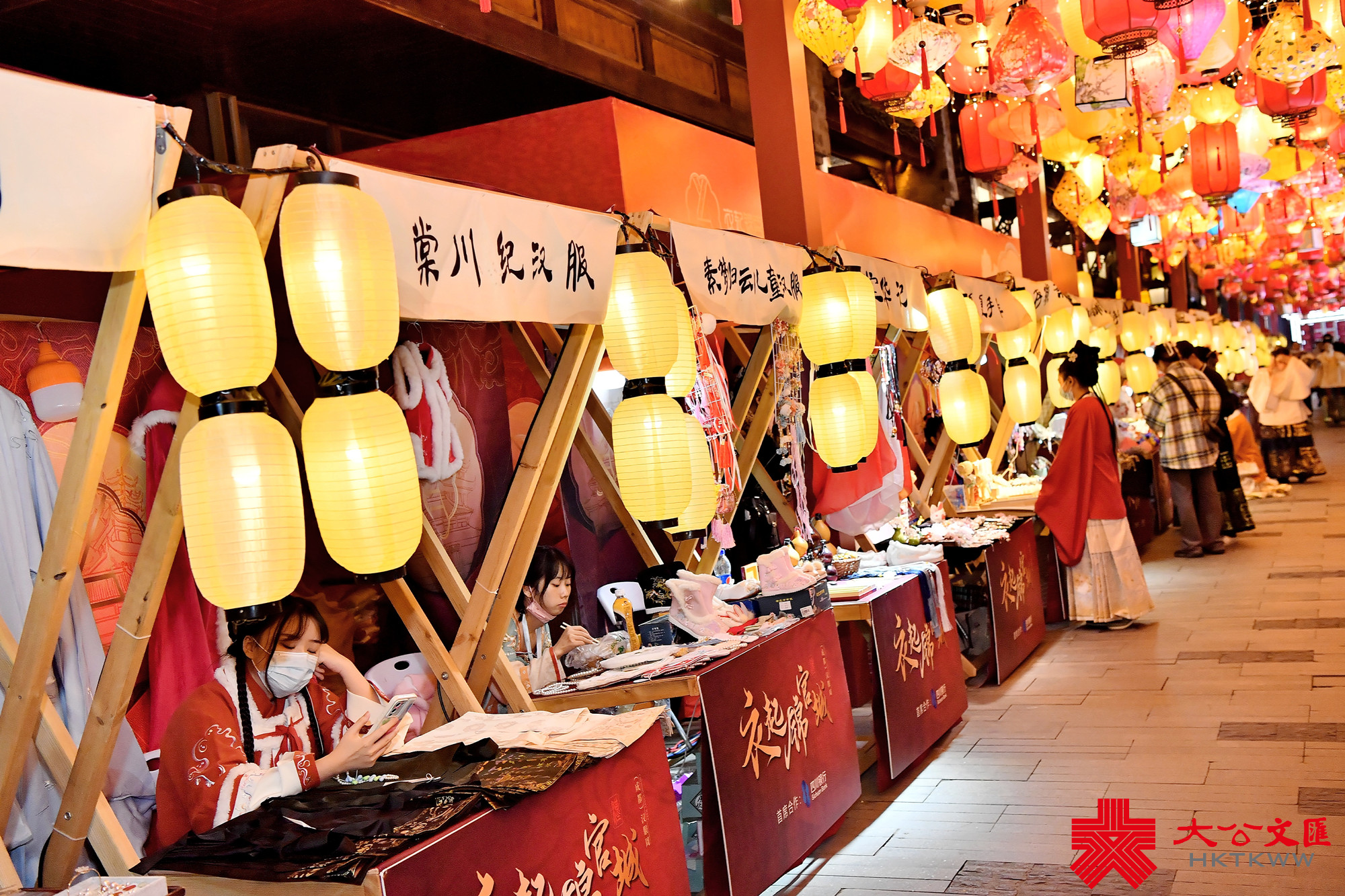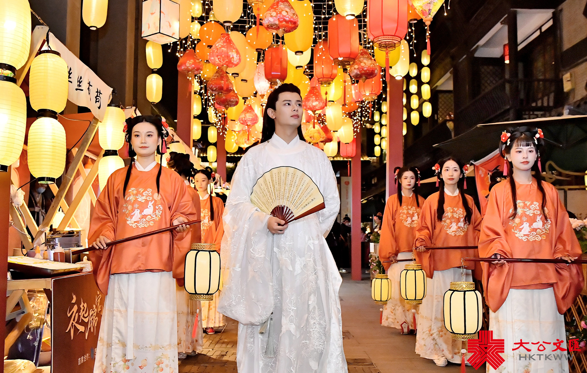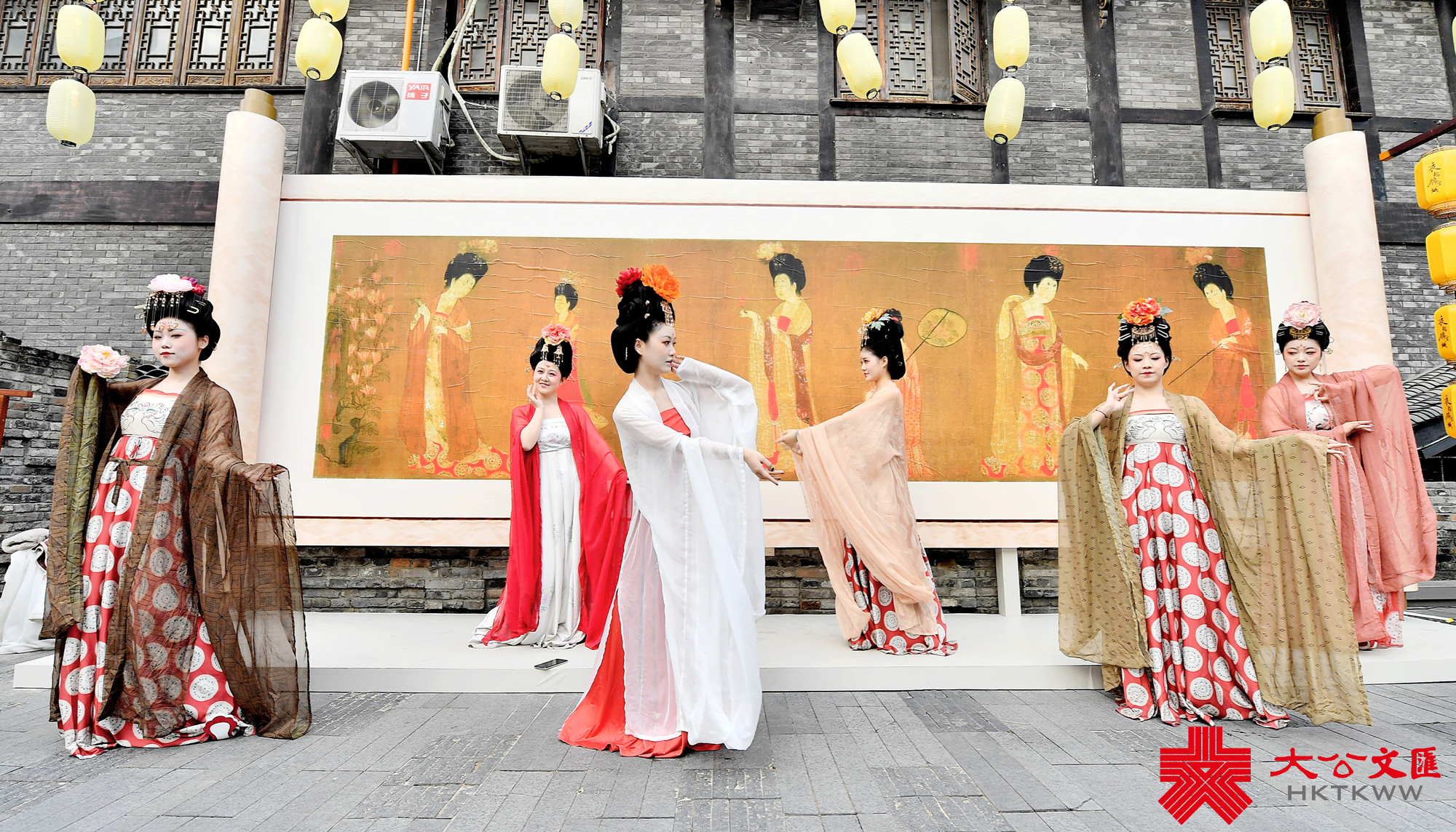 (大公文匯網記者 李兵)6名身着華麗漢服的女孩,或翩翩起舞,或嘻戲遊玩,她們好似從《簪花仕女圖》中姍姍而來,讓這幅千年古畫「復活」。「衣起錦官城 ,盛世譜華章」,11月4日晚,一場漢服秀在成都千年古街文殊坊上演,讓廣大遊客沉浸式體驗了一次「穿越」之旅。