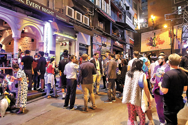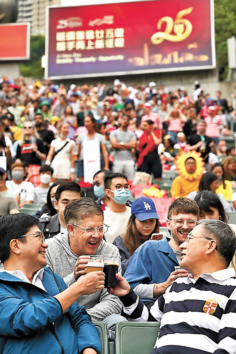 (香港文匯報 記者 張弦、文森)「香港國際七人欖球賽」的舉行使全城氣氛高漲,香港文匯報記者昨晚直擊不少球迷觀賽後「未夠喉」,賽後轉戰酒吧區暢飲狂歡,加上昨日是特區政府取消酒吧營業時間限制後首個周末,中環蘭桂坊久違地爆場。大批身穿七欖球衣的市民或遊客熙來攘往,「好耐無玩得咁盡興!」有酒吧業界表示,「鬆綁」加上七欖雙喜臨門,生意額提升最多三成,期望香港繼續舉行更多國際賽事,吸引更多遊客來港,逐漸復常。