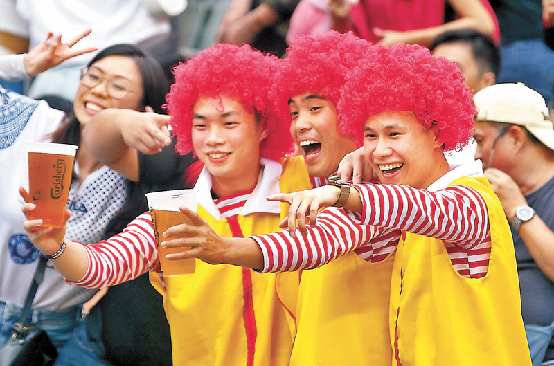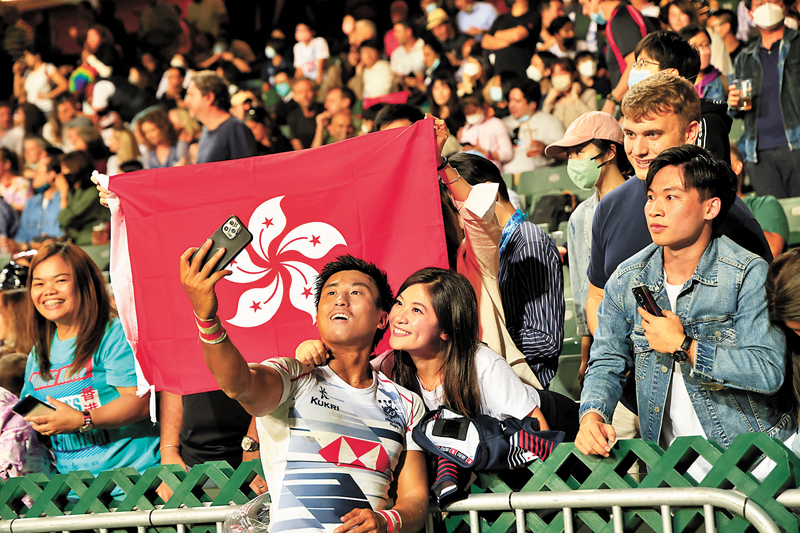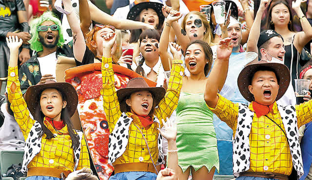 「香港、香港……」香港代表隊昨日再次出戰國際七人欖球賽。港隊主場,自然吸引大批市民入場打氣,「港隊加油」的歡呼聲震耳欲聾,整體的入場觀眾比首日為多,不少球迷都以奇裝異服打扮入場。觀眾Jenni表示,「第一次來(觀賽),我覺得現在的氣氛好好!」觀眾曾小姐:「好像忘記現在是疫情、好像全部回復正常,希望以後都是這樣。(氣氛如何?)超好,很開心。」