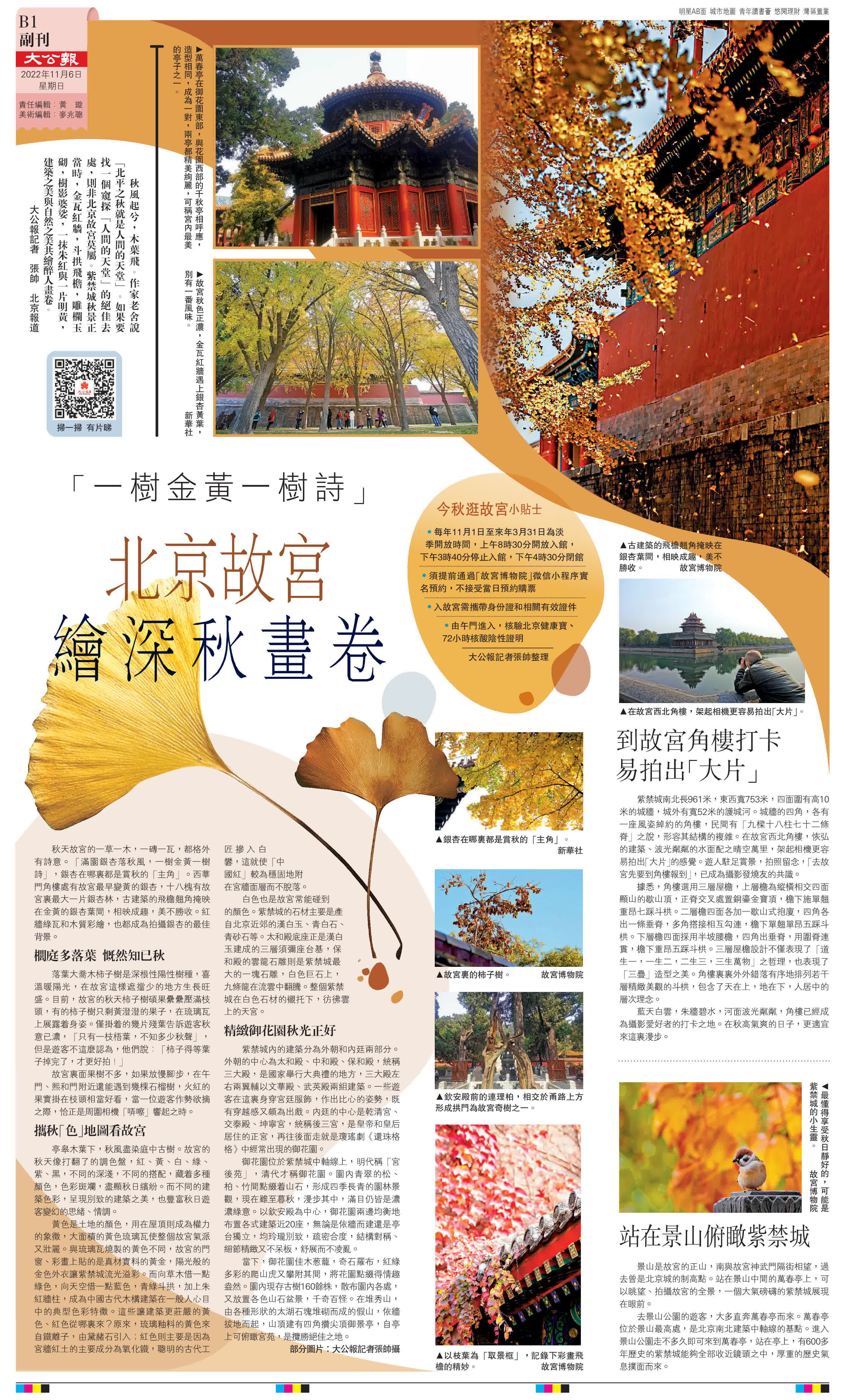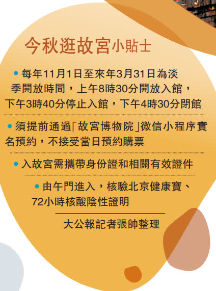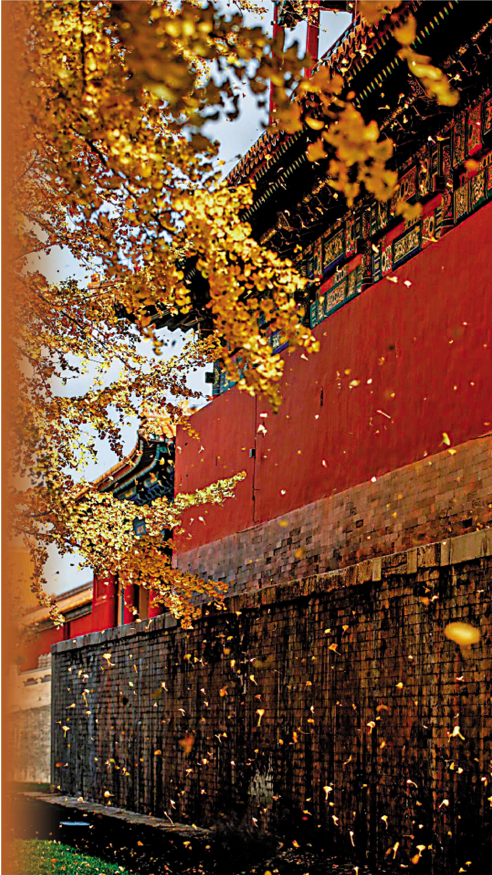 (大公報記者 張帥 北京報道)秋風起兮,木葉飛。作家老舍說「北平之秋就是人間的天堂」。如果要找一個窺探「人間的天堂」的絕佳去處,則非北京故宮莫屬。紫禁城秋景正當時,金瓦紅牆,斗拱飛檐,雕欄玉砌,樹影婆娑,一抹朱紅與一片明黃,建築之美與自然之美共繪醉人畫卷。