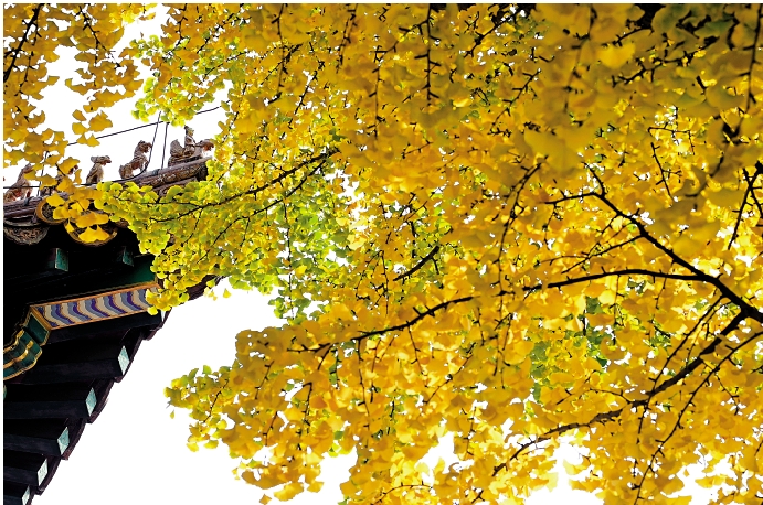 秋天故宮的一草一木,一磚一瓦,都格外有詩意。「滿園銀杏落秋風,一樹金黃一樹詩」,銀杏在哪裏都是賞秋的「主角」。西華門角樓處有故宮最早變黃的銀杏,十八槐有故宮裏最大一片銀杏林,古建築的飛檐翹角掩映在金黃的銀杏葉間,相映成趣,美不勝收。紅牆綠瓦和木質彩繪,也都成為拍攝銀杏的最佳背景。
