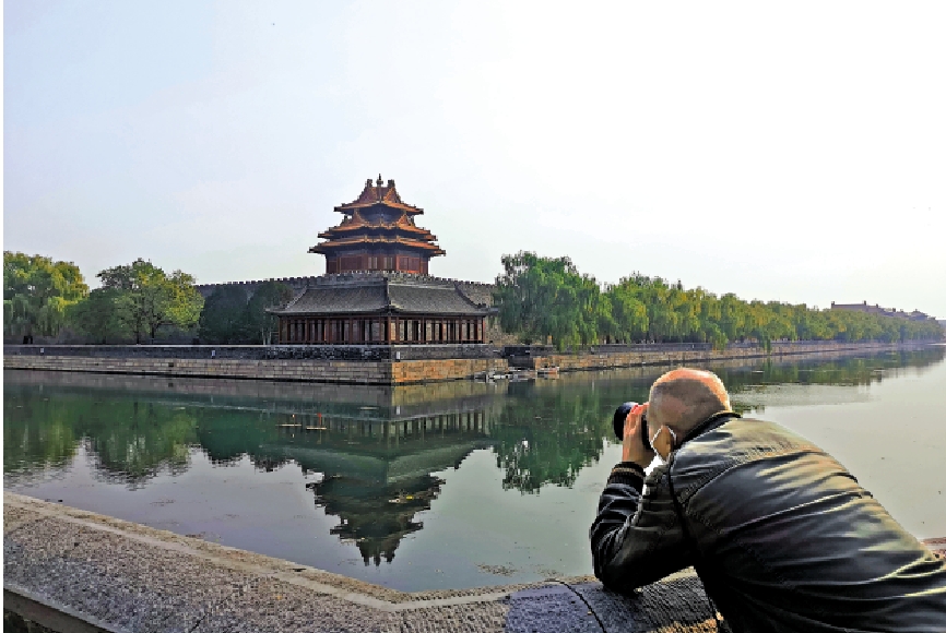 紫禁城南北長961米,東西寬753米,四面圍有高10米的城牆,城外有寬52米的護城河。城牆的四角,各有一座風姿綽約的角樓,民間有「九樑十八柱七十二條脊」之說,形容其結構的複雜。在故宮西北角樓,恢弘的建築、波光粼粼的水面配之晴空萬里,架起相機更容易拍出「大片」的感覺。遊人駐足賞景,拍照留念,「去故宮先要到角樓報到」,已成為攝影發燒友的共識。